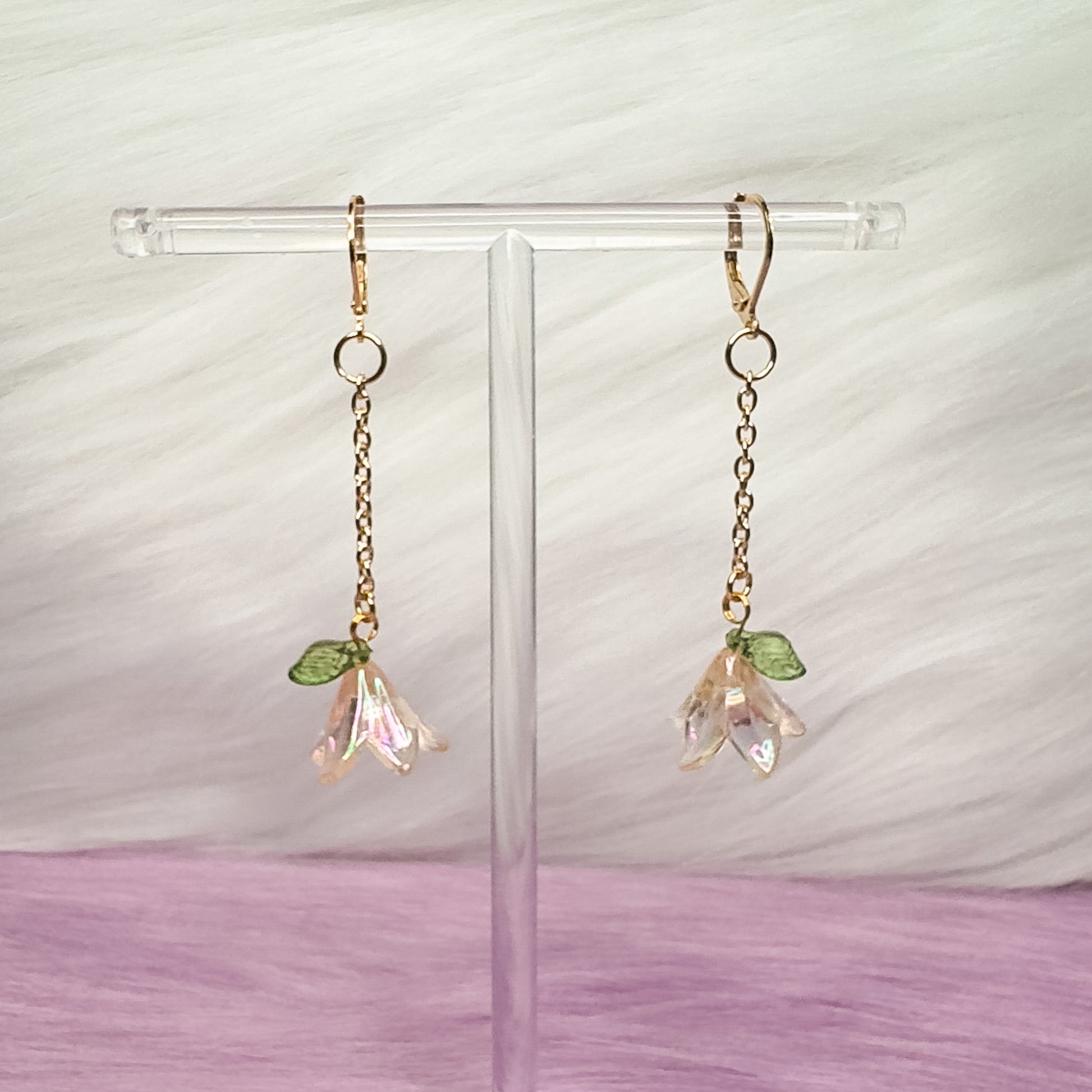This design features an iridescent lily flower pendant available in two ethereal colorways - pearlescent clear or light green. Designed to capture the beauty of the season, each flower is suspended from a a gold-toned chain finished with a matching 304 stainless steel lever-back hooks for secure, comfortable, and fashionable wear.