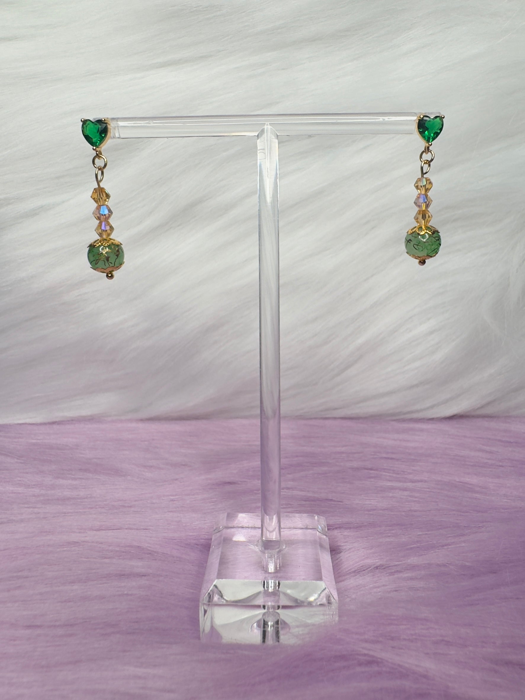 Dropped below, faceted amber glass beads catch the light with warmth and depth, leading to a marbled emerald glass sphere cradled in floral gold-toned caps.